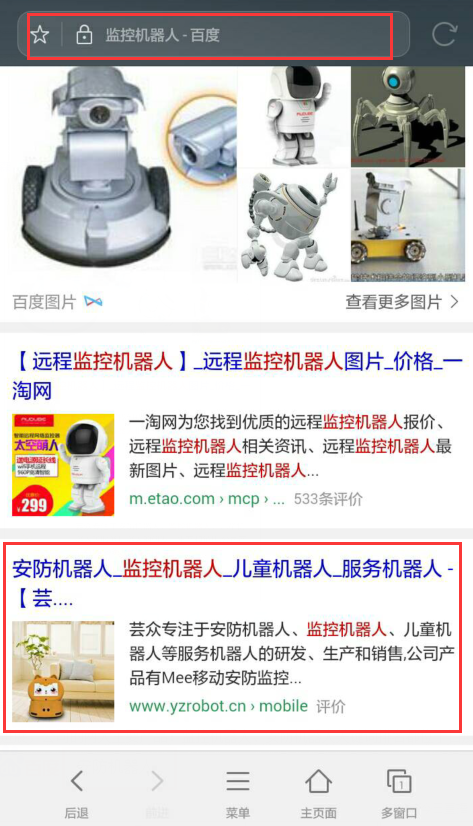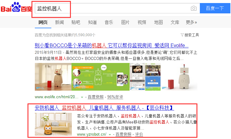 目前蕓眾的網(wǎng)絡(luò)推廣效果也取得了進(jìn)展,公司的兩大主要產(chǎn)品:監(jiān)控機(jī)器人、安防機(jī)器人關(guān)鍵詞排名都位于百度及百度移動首頁位置。
