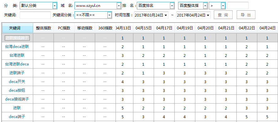 關(guān)鍵詞排名(縱列為關(guān)鍵詞對應(yīng)的排名,10名以內(nèi)為首頁,數(shù)字代表排在首頁第幾位,橫列代表日期)